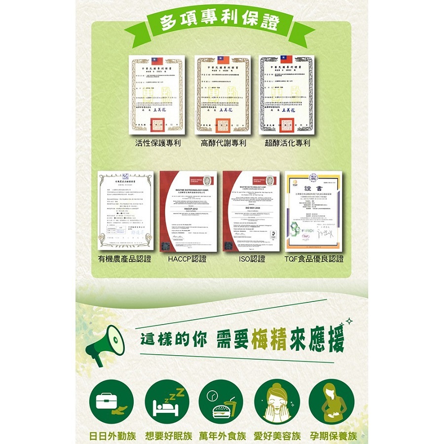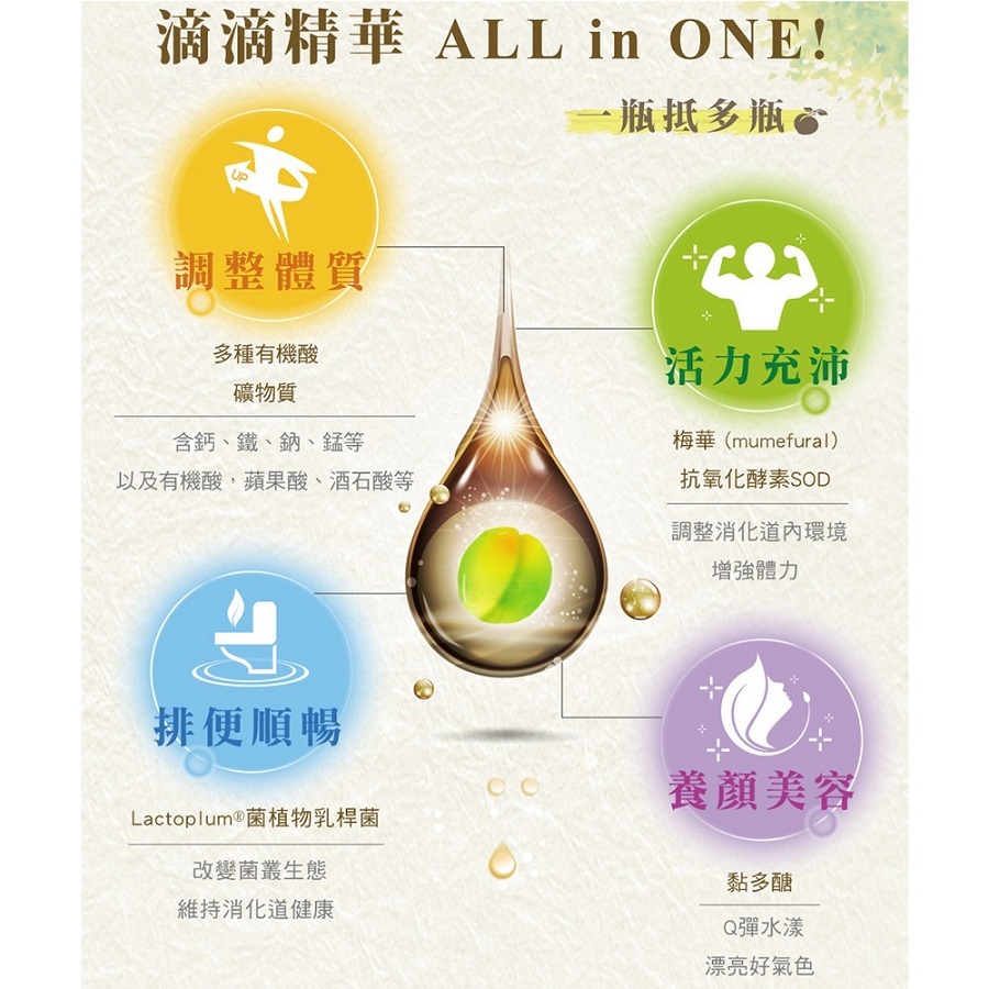 選用高雄甲仙高海拔無污染環境中,孕育出的六分熟手採有機青梅,完全無農藥疑慮,經100日專利發酵及低溫真空濃縮,和無重金屬、無農藥殘留、有機酸檢驗及SOD活性檢驗,富含有機酸、黏多醣、乳酸菌與微量元素,有助調整體質,活力充沛、養顏美容及排便順暢